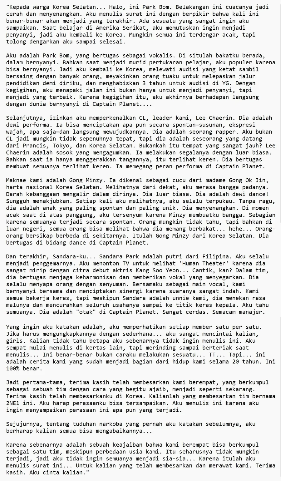 Park Bom membuka suratnya dengan menyebut ini mungkin jadi kesempatan terakhirnya berbicara. Ia ingin publik mendengar langsung versinya tanpa perantara.