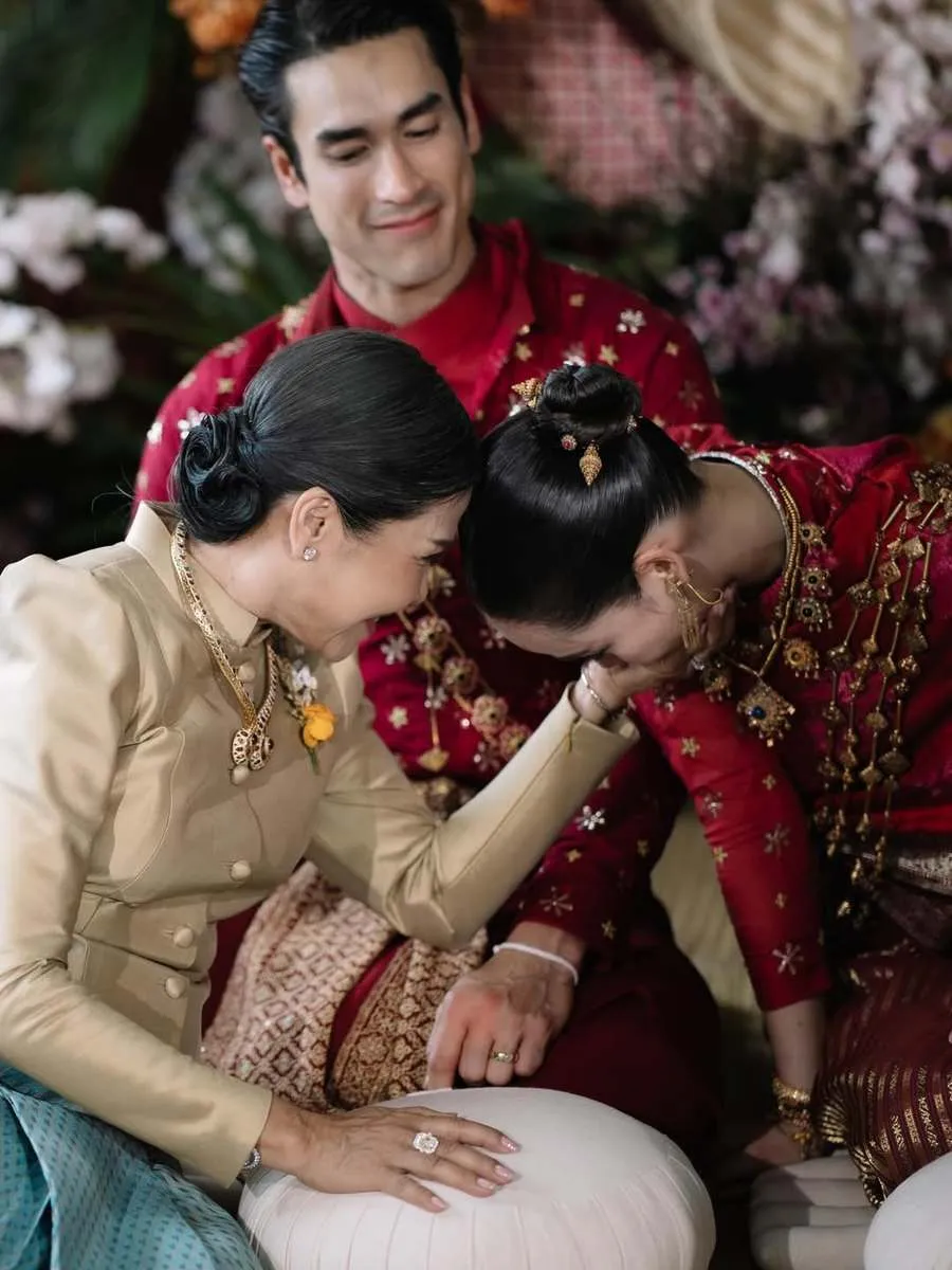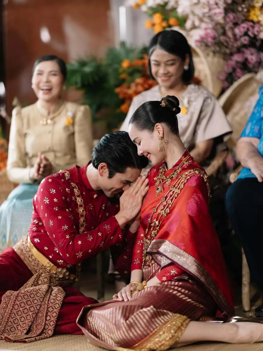 Yaya dan Nadech tampil serasi dalam pakaian adat bernuansa merah dan emas yang kental dengan sentuhan tradisional Thailand. Nadech mengenakan atasan merah berhias sulaman keemasan, dipadukan kain tenun bermotif senada, sementara Yaya tampil anggun dalam busana merah marun bertekstur silk dengan detail emas yang mewah. Rambutnya ditata rapi dengan sanggul tinggi dan aksesori kepala bernuansa adat.
