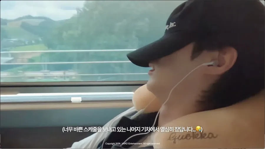 Layaknya penumpang kereta pada umumnya, Byeon Woo Seok tampak mendengarkan musik, makan roti, sampai tidur pakai bantal leher selama perjalanan yang memakan waktu sekitar 3 jam itu.